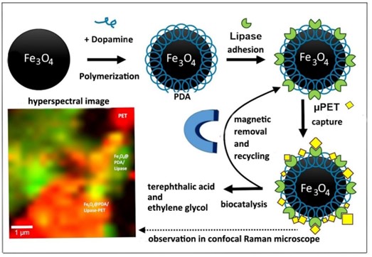 در مطالعهای که توسط توما انجام شد، نانوذرات مغناطیسی اکسید آهن (II, III)(Fe3O4) توسط رسوب همزمان سنتز شدن و بعداً با پلی دوپامین (PDA) با اکسید کردن جزئی دوپامین در یک محلول قلیایی ملایم برای تشکیل Fe3O4@PDA کوت شدند. لیپاز بر روی این بستر قرار گرفت. با گرفتن ذرات پلی اتیلن ترفتالات و نشستن آن ها روی سیستم، آنزیم لیپاز توانایی جهت تجزیه آن به ملکول های کوچکتر خود را دارد که شرح آن در شکل ذیل آمده است.