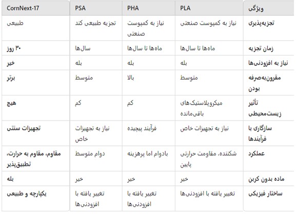 وجه تمایز CornNext-17 با پلاستیکهای سنتی و بیوپلاستیکهای رایج مانند پلیلاکتیک اسید (PLA) و پلیهیدروکسیآلکانوات (PHA) در حفظ ساختار طبیعی پلیساکاریدی آن است.